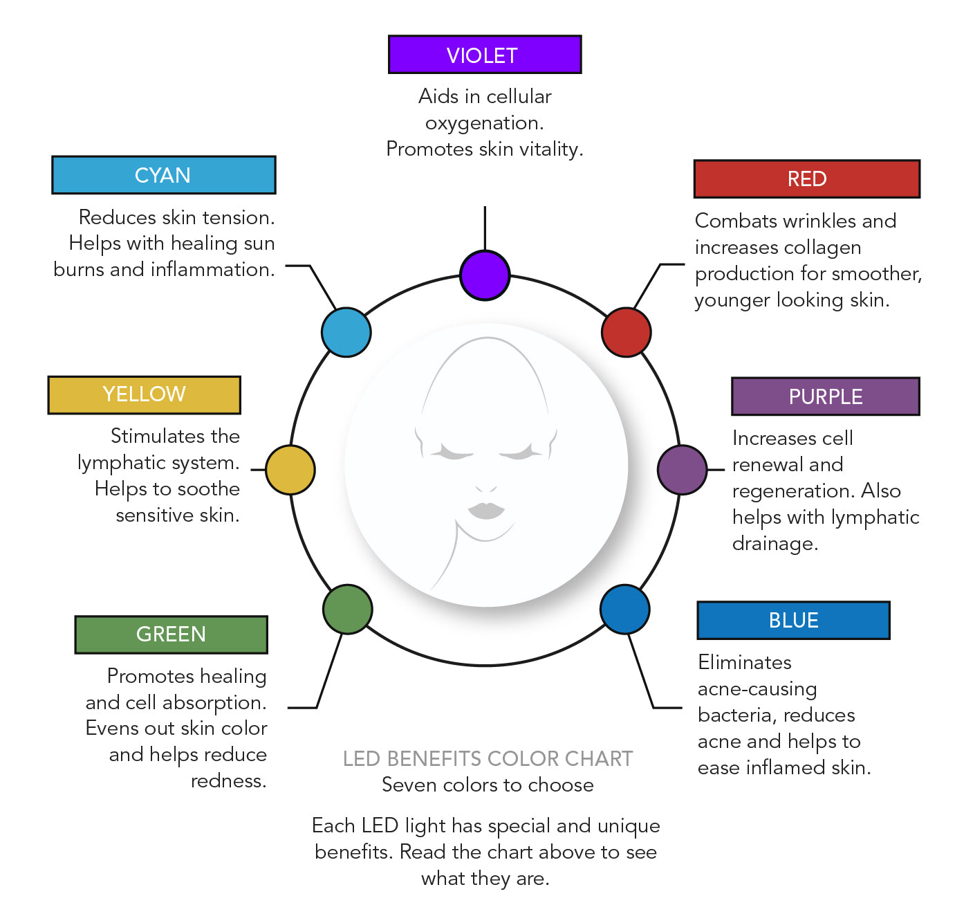 Benefits: Cyan light is used to improve skin vitality, texture, and overall radiance.